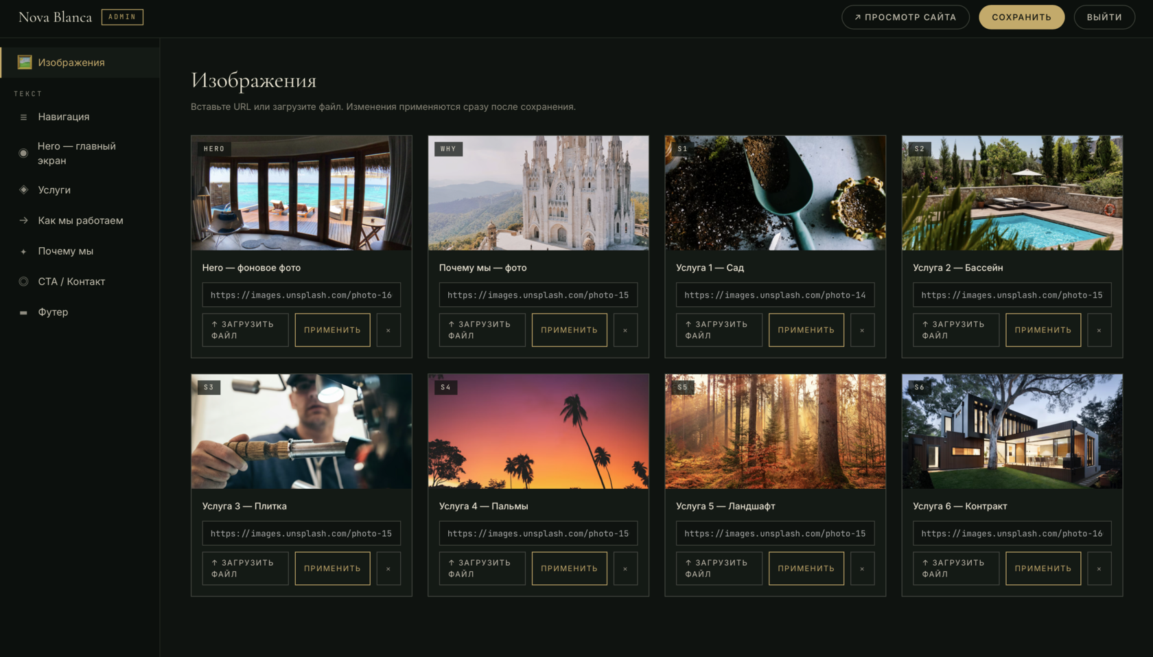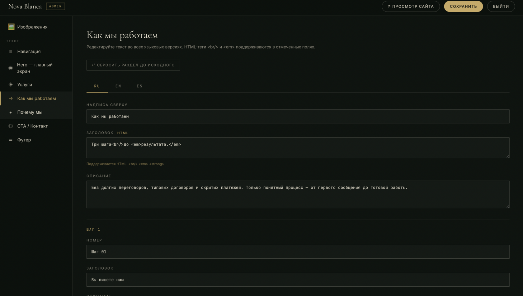 Владелец бизнеса может самостоятельно менять любые тексты на сайте и фотографии — через встроенную CMS-панель с авторизацией. Никаких технических знаний не требуется.