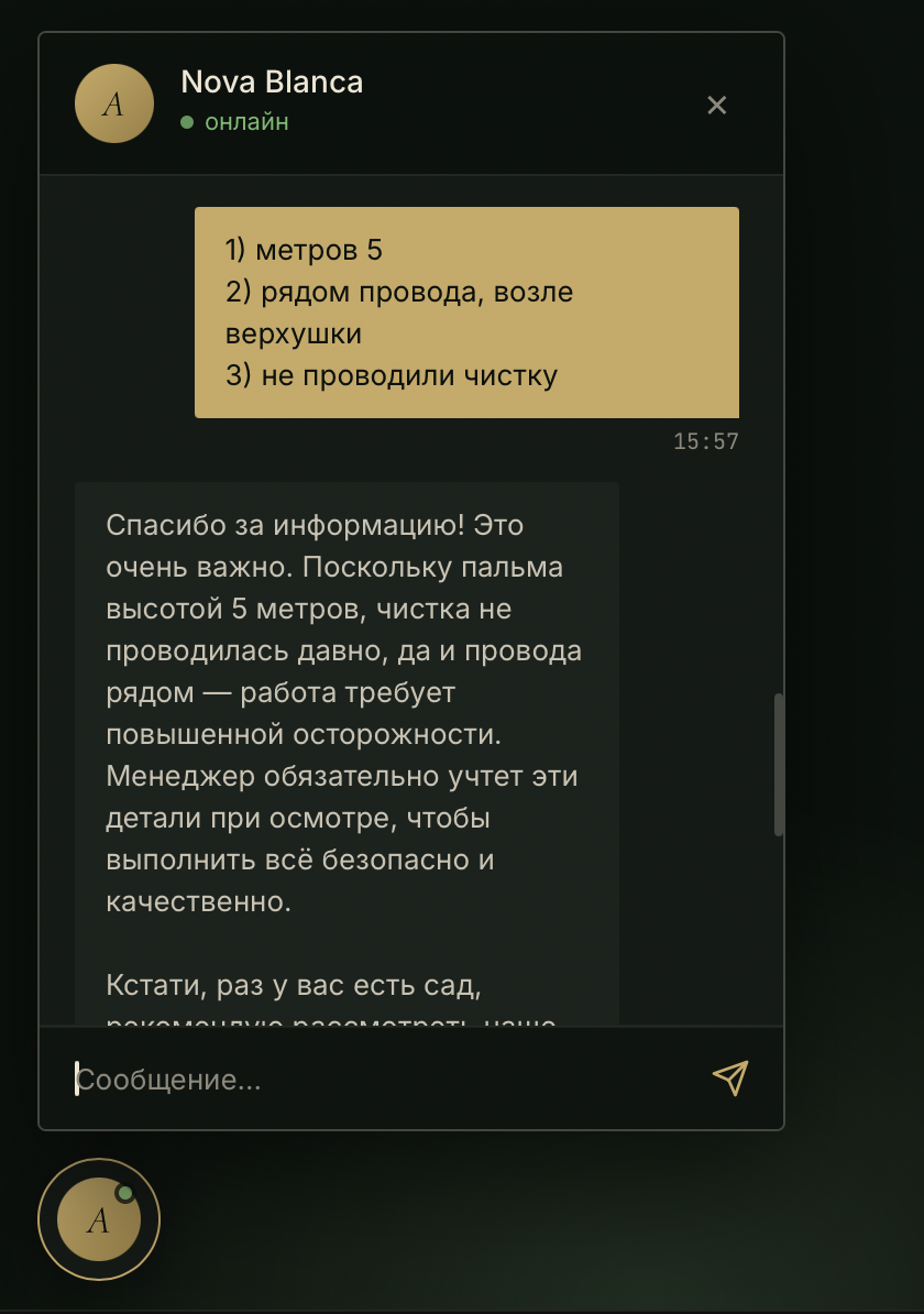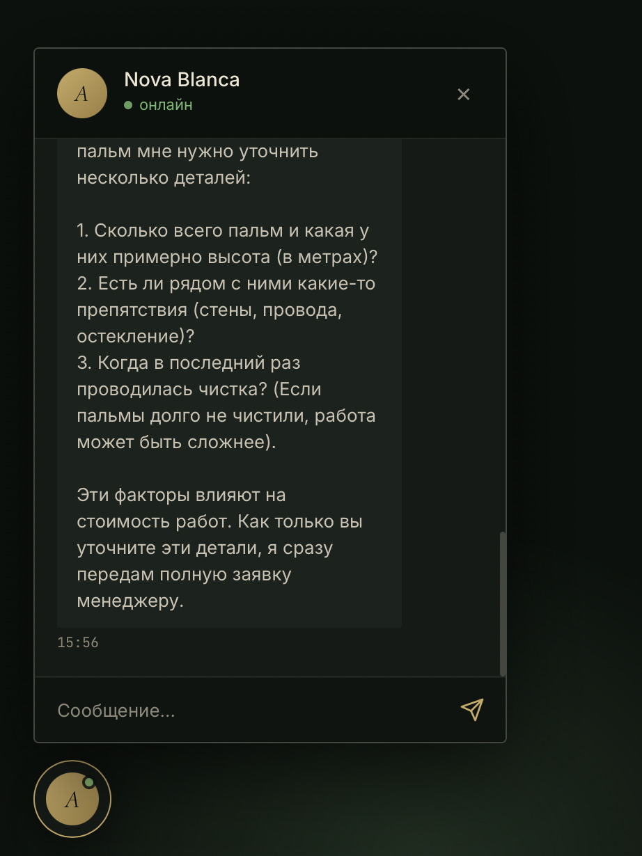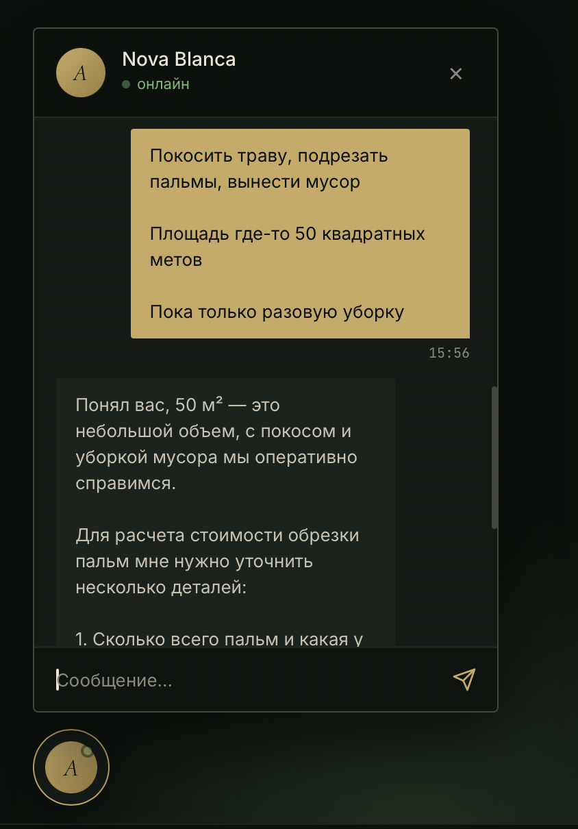 Он знает все услуги, понимает специфику региона, умеет объяснить разницу между разовой уборкой и контрактом, знает ценовые вилки по высоте пальм и типу загрязнения плитки, понимает, почему бассейн лучше чистить дважды в месяц — и может объяснить это клиенту так, как это сделал бы опытный менеджер по продажам.