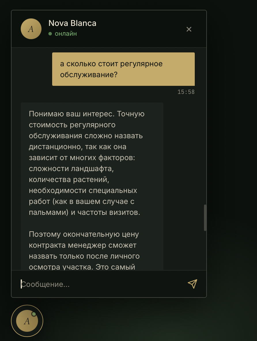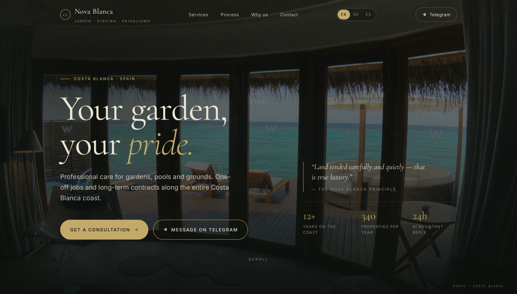 Nova Blanca — компания, оказывающая услуги по уходу за садами, бассейнами, обрезке пальм и ландшафтному дизайну в регионе Коста-Бланка. Клиентская база — русскоязычные, англоязычные и испаноязычные жители региона. Задача: создать представительный лендинг, который не просто показывает услуги, но и самостоятельно обрабатывает входящий поток клиентов без участия менеджера на первом этапе.