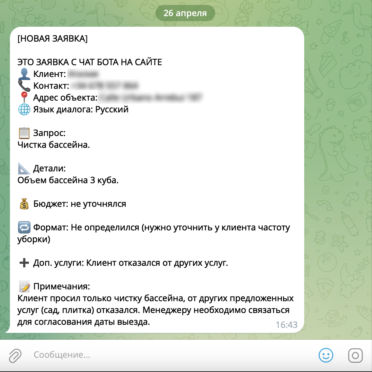 Когда все данные собраны, Алекс завершает диалог с клиентом — и параллельно автоматически отправляет структурированную заявку менеджеру в Telegram. Заявка содержит имя, контакт, адрес, суть запроса, детали и язык диалога. Менеджер получает всё необходимое для звонка — без ручного ввода и переписки.